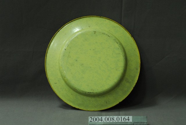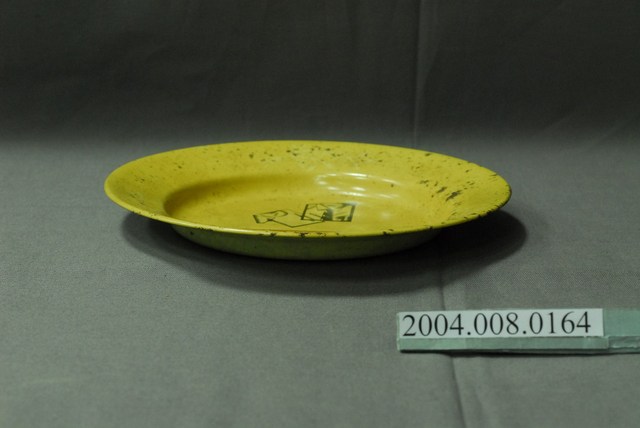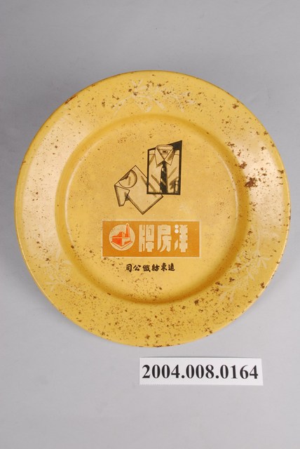 1.洋房牌遠東紡織公司黃色搪瓷圓盤,為遠東紡織股份有限公司的紀念盤。圓形、平底淺盤,盤面中央作圓形下凹,盤緣向外略斜上平折,盤沿往外向下內捲作圓弧邊。以鐵金屬為胎,表面塗有黃色瓷釉,盤底素面無紋,正面盤緣裝飾三束白色花卉紋飾,但顏色與底色相近,且盤面佈滿褐色鐵鏽斑點,因此並不明顯,盤面印有一件白色男性襯衫繫黑白斜紋領帶與一件白色T恤圖案,下方有一白邊土黃色塊印「洋房牌」品牌字樣與商標,色塊下方印有「遠東紡織公司」六個黑色小字。2.遠東紡織公司的前身為遠東織造廠股份有限公司,於1945年在上海創立,生產洋房牌內衣,1949年隨國民政府遷臺,繼續生產針織產品,1953年成立紡織廠推出棉紡產品,1954年正名為遠東紡織股份有限公司,後來企業轉為多角化經營,2009年更名為遠東新世紀股份有限公司。