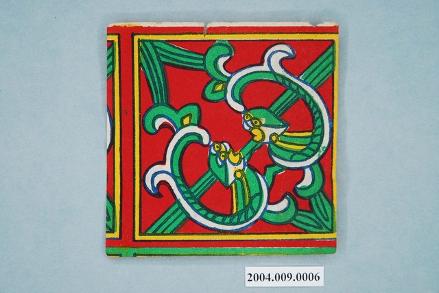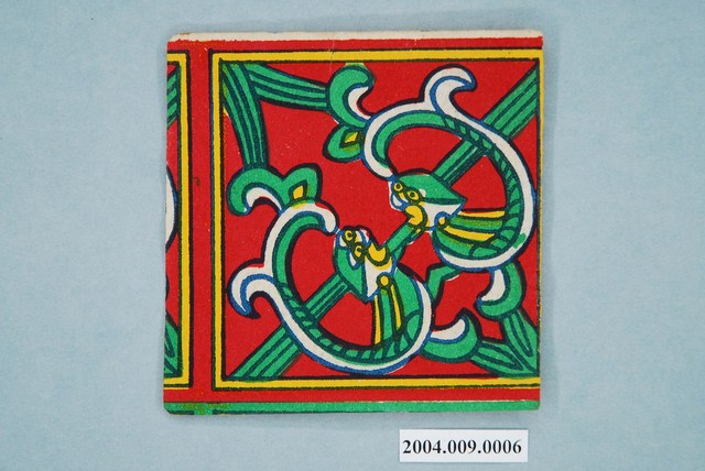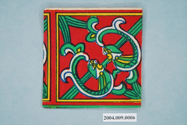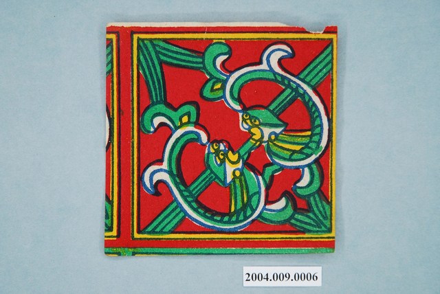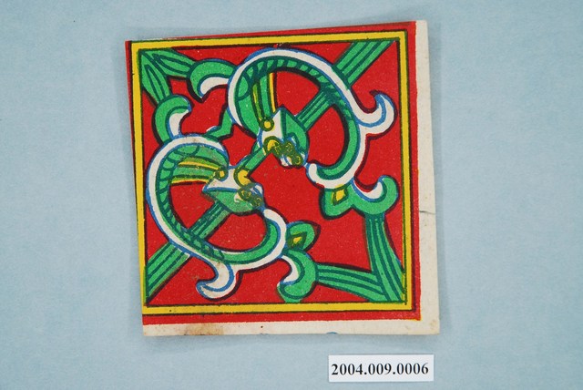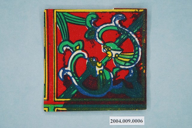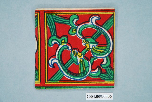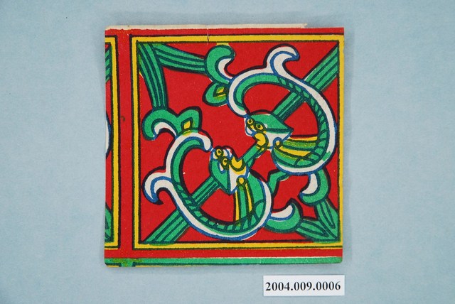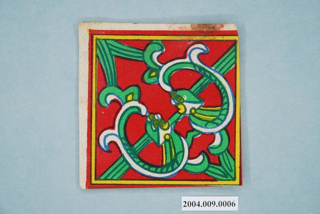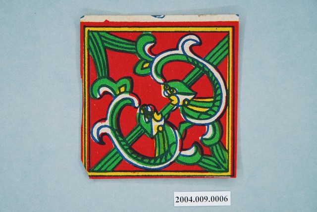 本組螭虎彩紙共有十幅,每幅皆為同一式樣,可拼湊成二方連續圖案,主要做為糊紙的配件,用於裝飾宮殿。螭虎彩紙以藍色為線條,套印紅、綠、黃等顏色而成,畫面以斜對角為準作對稱之圖案,使兩隻螭虎成為面對面形式。本組的螭虎無腳,虎尾部作卷草形,民間俗稱草尾龍。