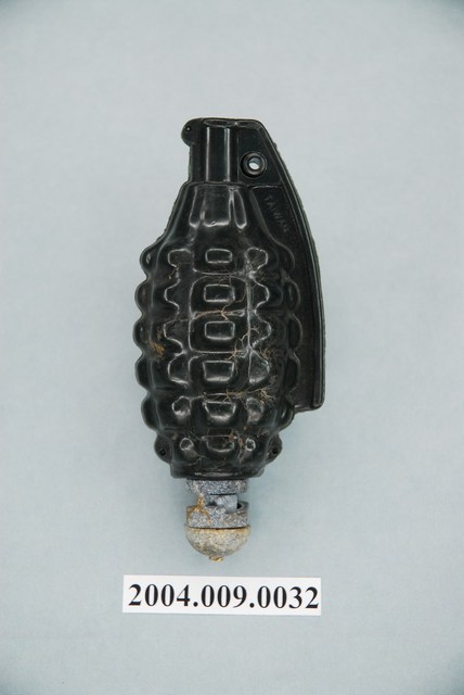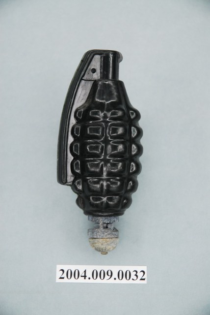 本物件為手榴彈造型玩具,主要材質為塑膠,整體呈橢圓形狀,保險桿及外殼為黑色,外殼紋路凹凸如波羅,單側保險桿上方有「TAIWAN」字樣,底部有灰色如磨石子材質的設計。
