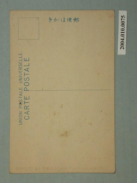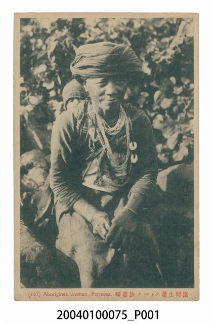 1.本物件為以臺灣原住民為主題之明信片,其正面為臺灣鄒族婦女裝扮黑白照片,畫面中可見婦女戴有頭巾,胸前掛有裝飾繁雜的項鍊,婦女坐在石頭上,背後揹有一名孩童,明信片下方有「(767)Aborigines woman,Formosa.」、「台灣生蕃ツオーヲ族蕃婦」字樣;背面為明信片橫式書寫面,以藍色單色印刷,右上角有郵票黏貼處,右側有「郵便はがき」,正上方則有「UNION POSTALE UNIVERSELLE」及「 CARTE POSTALE」字樣。2.臺灣原住民屬南島語族,多分布於臺灣東部地區,在漢人開墾及日治時期的「理番政策」下,其生活空間不斷被壓縮,甚至是削弱文化特色,時至臺灣光復後原先以九族劃分,現今已增至十六族。鄒族,舊名「曹族」一稱,主要分布於嘉義阿里山區一帶,人口極少。