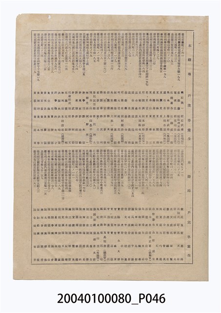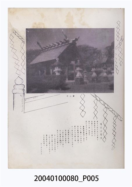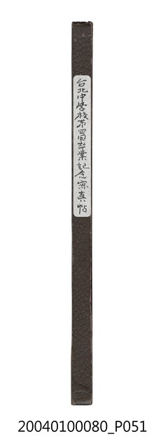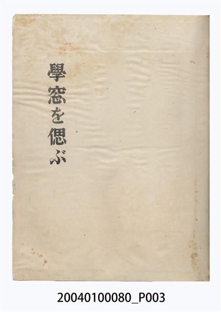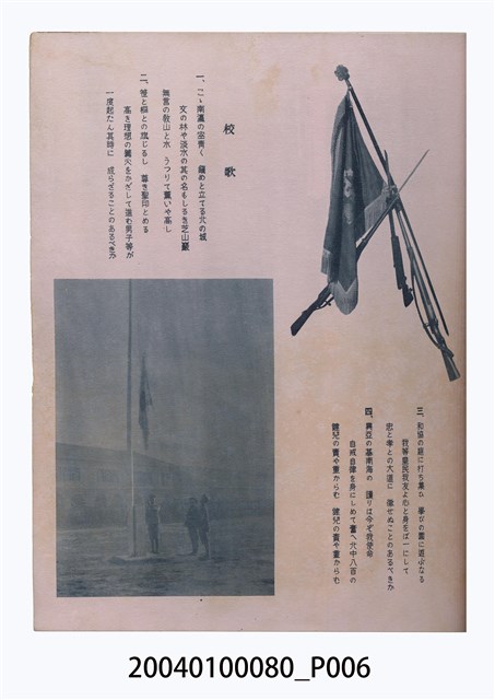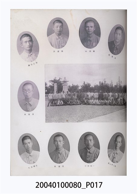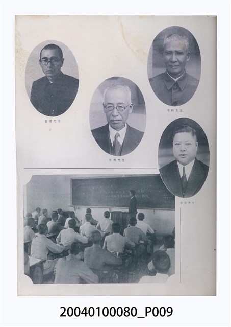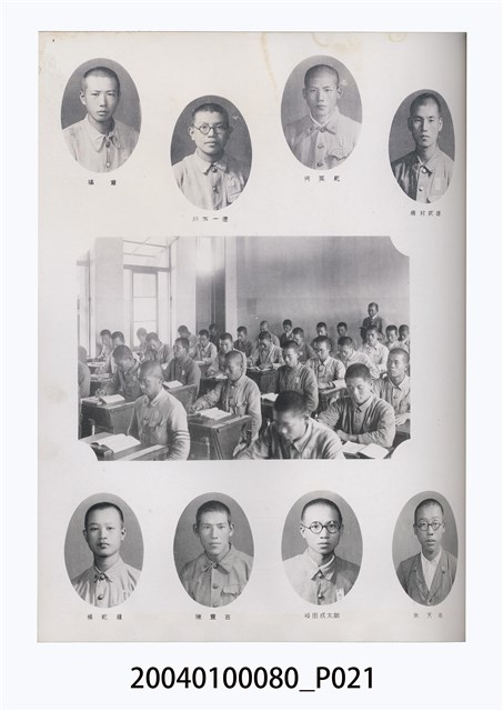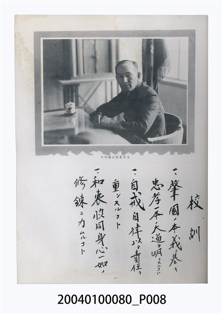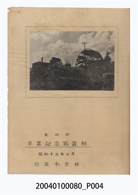 本件為《臺北中學校第4屆畢業紀念冊》,黑白印刷,製作時間為昭和19年(1944)3月。內容主要為教職員大頭照、學生大頭照、校歌、校旗照、班級活動照,課堂照、社團成員合照、校園生活照、校長木村雄三照片、戲水照、臺中神社留影、臺中公園留影、體育活動照(籃球、體操、相撲、田徑)、武道活動照(柔道、劍道)、音樂社團活動照、校外教學照等,尾頁附有畢業生名冊。臺北中學校(今臺北市私立泰北高級中學),其前身可追溯於1916年建置於臺北東門外的「私立臺灣佛教中學林」,至 1938年遷校於士林街現址,並更名為「私立臺北中學校」。戰後臺北中學校奉令改稱「臺北市私立泰北中學」,關於校名變遷之沿革,如下:1916年,私立臺灣佛教中學林;1922年,私立曹洞宗臺灣中學林;1935年,私立臺北中學;1938年,私立臺北中學校;1947年,臺北市私立泰北中學;1972年,臺北市私立泰北高級中學。