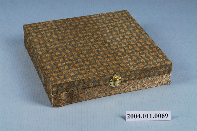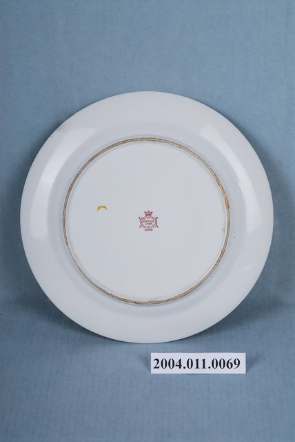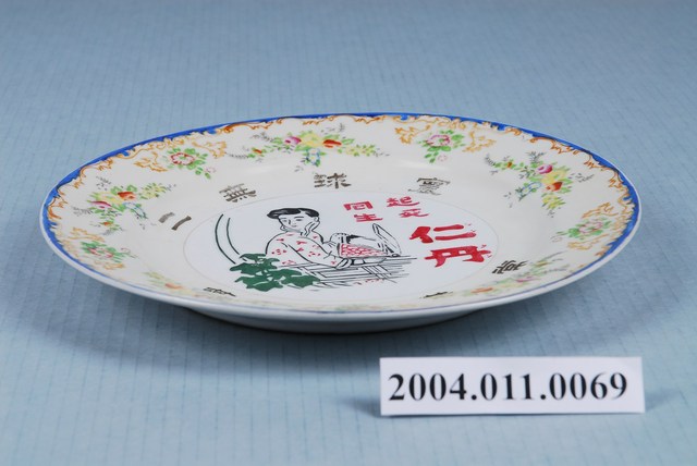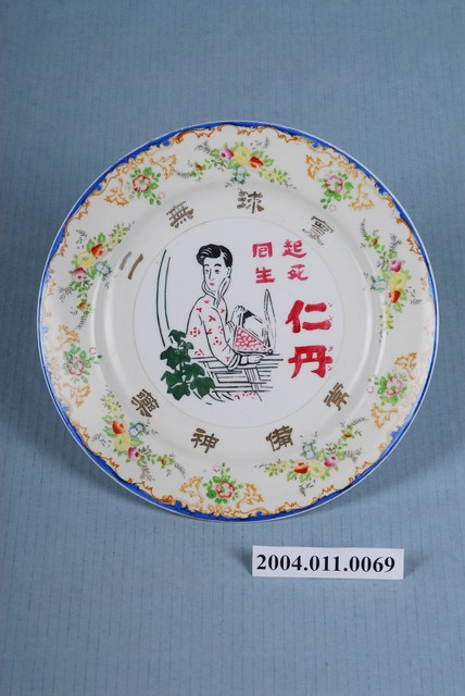 1.釉上彩仁丹紀念圓盤組為日本森下仁丹株式會社的紀念圓盤與專為其製作的一正方形錦緞收納盒。瓷製圓盤盤面裝飾華麗細緻,以彩釉在折沿處轉印上藍邊與紅色波狀紋飾,以及顏色鮮豔亮麗的花草紋樣,盤面中央印繪一女性形象,周圍書「寰球無二」、「常備神藥」、「起死回生仁丹」等經典標語,器底素面無紋,落有紅色皇冠裝飾的方形款識,書「Krescent China Japan」等字樣。錦盒以金錢紋為紋飾,內襯金黃色緞面布料。2.仁丹是日本森下仁丹株式會社所開發的一款口服成藥,自1905年開始販售至今,歷史悠久。社長森下博在甲