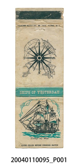1.本物件為火柴彩色商標1張。商標為長條狀,最上方印有黑字「DIAMOND MATCH DIV.」、黑色菱形圖樣、「NEW YORK,N.Y.」,文字下有1幅方向標圖樣,順時針方向標示「S」、「E」、「N」、「W」,在方向標4角繪有船舵、望遠鏡、船錨、救生圈圖樣;商標中央有綠底白字「SHIPS OF YESTERDAY」;商標下方繪有1幅單桅帆船圖樣,圖樣下方有黑字「Sloop-of-War」、「CLOSE COVER BEFORE STRIKING MATCH」。