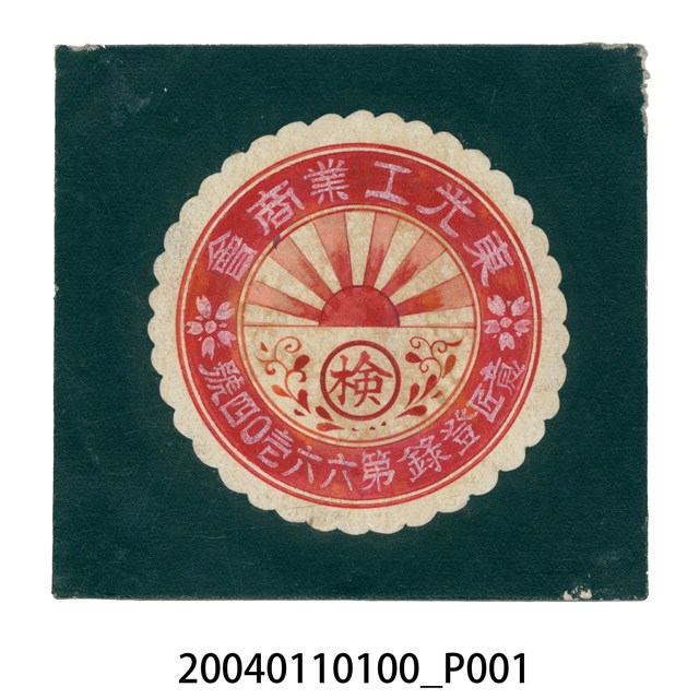 1.本物件為彩色商標1張。商標為圓形波浪紋,白底紅色印刷設計;商標外圈有文字「東光工業商會」、「意匠登錄第六六壱0四號」,文字中間繪有2朵櫻花圖樣;商標正中央印有紅日初升圖樣,及花紋環繞的「検」字圓戳印。