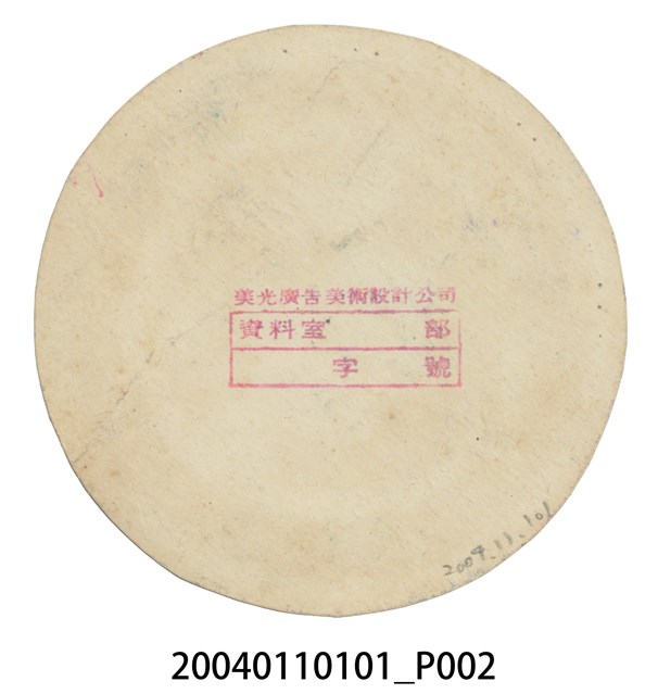 1. 本件為設計用在豆乳罐頭包裝上所的標籤紙原稿,圓形,單面彩色繪。2. 標籤圖案最外圈為白色邊條。第二圈為紅色框條藍底,上有白色「鮮大王A字豆乳」、「上海標準味粉廠醬品製造工場出品」字樣,左側中間有一小紅星圖樣。最內圈為紅色框條黃底,繪製一位穿著廚師服面露笑容的胖廚子,左手拿著此件罐頭產品,右手舉起大拇指做出比讚的手勢,頭上有紅色「豆乳」字樣。上下各有一紅色邊條;標籤圖案以藍、黃色塊為底;藍色塊部分有一紅色雙線圓形框,框內藍色塊部分為紅色的「鮮大王A字豆乳」字樣。因年代久遠,標籤紙有泛黃、褪色、摺痕的現象。3. 原稿背面有明顯透暈色塊與明顯泛黃污漬狀況,中間蓋有紅色「美光廣告美術設計公司」的收藏章印,以及鉛筆標註「2004.11.101」的編號字樣。4. 臺灣罐頭食品產業始於日本治臺時期,為了吸引顧客購買,各製造商家會設計具有產品特色辨識度的商標圖案來吸引購買,商標上通常會列出品名、製造者、地區、電話等字樣。即使在戰後,此種商標設計的模式仍被延續下來。