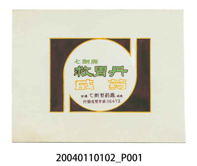 1. 本物件為商標原稿。商標為深棕色底,有一白色似胃部之圖形位於正中央,文字皆在圖形之內。文字印有七劍牌、救胃丹、成藥、臺灣屏東七劍製藥廠、內衛成製字第0647號。