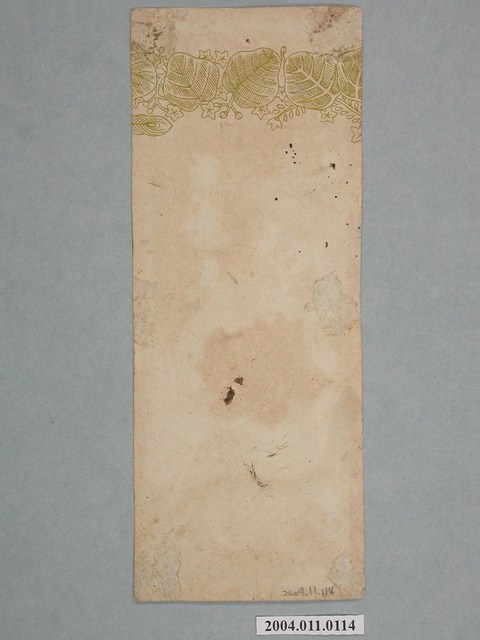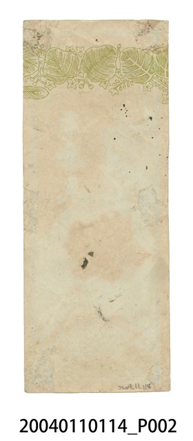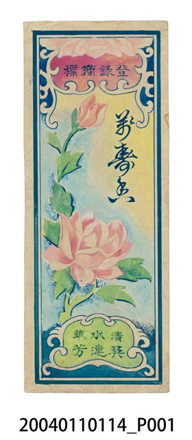1.本物件為香鋪彩色廣告商標1張。商標為長條狀,商標正面外圍是藍色圖框,框內正上方雲朵圖樣內印有藍字「登錄□標」;商標中央繪有1株連葉紅牡丹,右側印有草書藍字「彩□魚」;商標下方雲朵圖樣內印有綠底藍字「清水鎮吳連芳」。商標背面最上方印有連續綠葉藤蔓圖樣。