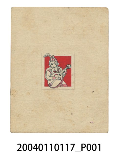 1.本物件為彩色商標貼紙1張。商標貼紙貼在1白色長方紙中央,貼紙為白框紅色底,繪有1隻穿著禮服戴羽毛禮帽,手彈吉他的猴子卡通圖像。