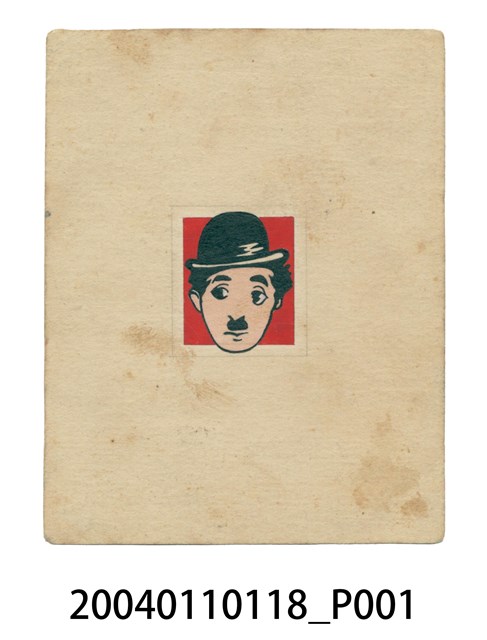 1.本物件為彩色商標貼紙1張。商標貼紙貼在1白色長方紙中央,貼紙為白框紅色底,繪有卓別林的卡通化圖像。