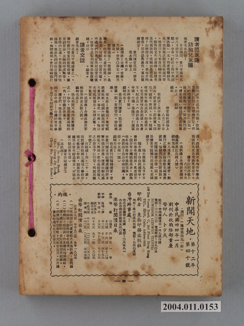 此為一紙質雜誌,封面照片人物右邊為新加坡和香港的知名電影製片人陸運濤與其妻子。此書為新聞天地雜誌社於1956年(民國45年)6月23日出版的《新聞天地》雜誌第12年第25號總號第436期。 本刊物的創辦者為卜少夫 ,為中國知名報人。卜少夫於1941年起進入《中央日報》系統,在1945年以美國《時代》雜誌為參照,試圖開辦屬於中國的綜合性雜誌,《新聞天地》即為初步嘗試。在1946年至1949年間,《新聞天地》為中國境內銷售排名前三之刊物。1949年後,《新聞天地》移往香港運作,並增添英文版。由於卜少夫曾於中國國民黨位居要職,在政治與媒體界交遊廣闊,亦甚敢言,《新聞天地》在戒嚴時期為臺灣讀者提供了涵蓋中、港、臺三地之新聞訊息,而其報導內容亦有時觸犯中華民國當局的言論管制政策。