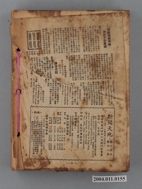此為一紙質雜誌,此書為新聞天地雜誌社於1956年(民國45年)10月13日出版的《新聞天地》第12年第41號總號452期。 本刊物的創辦者為卜少夫 ,為中國知名報人。卜少夫於1941年起進入《中央日報》系統,在1945年以美國《時代》雜誌為參照,試圖開辦屬於中國的綜合性雜誌,《新聞天地》即為初步嘗試。在1946年至1949年間,《新聞天地》為中國境內銷售排名前三之刊物。1949年後,《新聞天地》移往香港運作,並增添英文版。由於卜少夫曾於中國國民黨位居要職,在政治與媒體界交遊廣闊,亦甚敢言,《新聞天地》在戒嚴時期為臺灣讀者提供了涵蓋中、港、臺三地之新聞訊息,而其報導內容亦有時觸犯中華民國當局的言論管制政策。