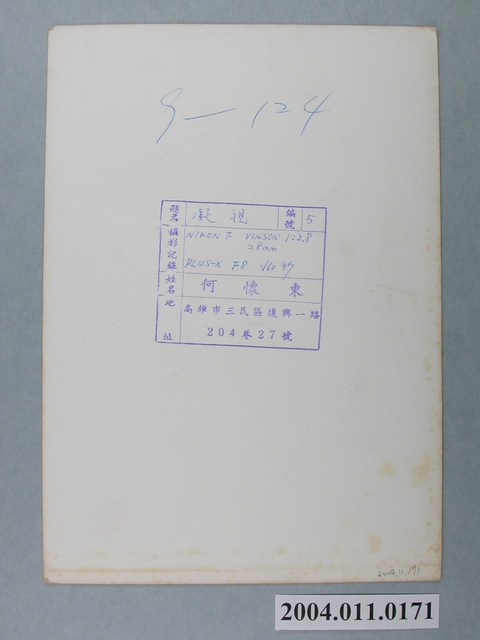本物件為何懷東攝影作品凝視。物件本體為一張直式黑白照片,影像滿版無留白色邊框,四個邊角有凹折痕跡。圖像中聚集非常多人,在鏡頭最前方的孩童,個個站立於椅凳上,抬頭凝視著前方,看得目瞪口呆。物件背面有題名、編號、攝影記錄、姓名、地址等資料欄位,清楚寫有攝影者為何懷東,及其拍攝此張照片時使用的攝影模式等資訊。在欄位上方寫有「9-124」的數字編號。
