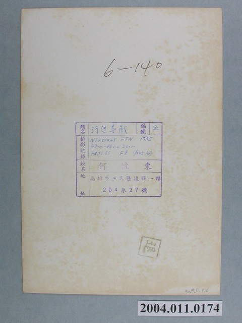 本物件為何懷東攝影作品河邊喜戲。物件本體為一張直式黑白照片,影像滿版無留白色邊框。圖像中四名孩童在河邊泥濘地嬉戲玩耍。物件背面有題名、編號、攝影記錄、姓名、地址等資料欄位,清楚寫有攝影者為何懷東,及其拍攝此張照片時使用的攝影模式等資訊。在欄位上方寫有「6-140」的數字編號;下方印有一寫有「退」的方型戳章。