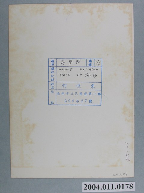 本物件為何懷東攝影作品樂幽幽。物件本體為一張直式黑白照片,影像滿版無留白色邊框。圖像中特寫一名頭綁髮帶,眉頭深鎖的婦人抽著香菸。物件背面泛黃,印有題名、編號、攝影記錄、姓名、地址等資料欄位,清楚寫有攝影者為何懷東,及其拍攝此張照片時使用的攝影模式等資訊。在物件右下方寫有「1-148」的數字編號。本物件與登錄號2004.011.0177應屬於一系列作品。