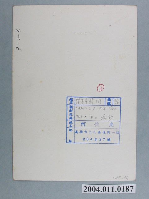 本物件為何懷東攝影作品望子早歸帆。物件本體為一張直式黑白照片,影像滿版無留白色邊框。圖像中一名年邁的男子雙手插腰,身穿長袖衣褲,腳穿夾腳拖鞋,站在沙灘地,眼神憂愁的凝視遠方。身後停泊多艘漁船,有一名孩童懸掛在船頭嬉戲。物件背面有些許污漬,印有題名、編號、攝影記錄、姓名、地址等資料欄位,清楚寫有攝影者為何懷東,及其拍攝此張照片時使用的攝影模式等資訊。在物件左上方寫有「7-206」的數字編號;欄位上方用紅字標示一個畫圈的「1」。
