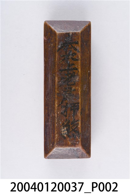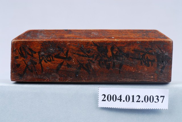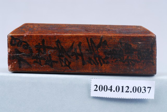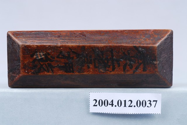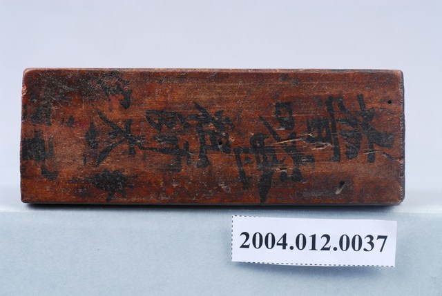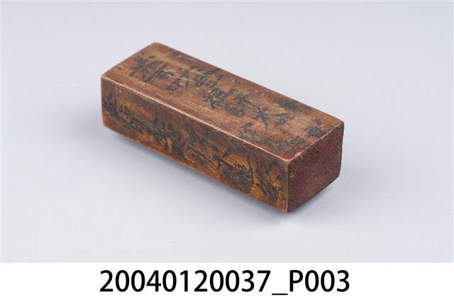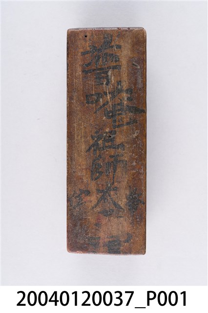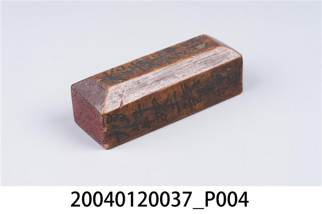 本件奉旨以木雕製作,上下左右四面墨書符令。奉旨為立體長方形木塊,上方一面在與四邊交接處作斜面轉折,而使其側面上半部成為寬梯形。上方一面墨書符令「奉太上老君押煞」,左右兩面分別書「九犇破土煞速押退」、「金棹金碗收水退煞」,底面則書「普唵祖師太○罡」,太字兩旁為「勅令」、「平安」,字跡磨損難以辨識。