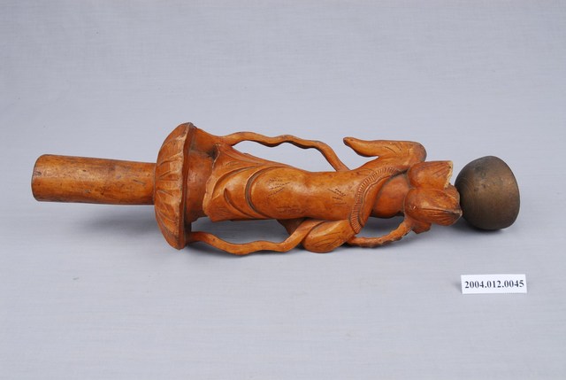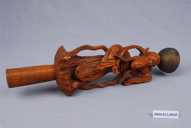 本件引磬製作手法相當精緻,磬體為銅鑄、開口朝上之小缽,握把則以木雕製作,在握把之上雕一名站立於荷葉之上的仕女,左手上舉,右手托一株花朵延伸至頭上的蓮花,木雕部份保留木質之澄黃色而未施彩繪,為罕見的引磬造形。