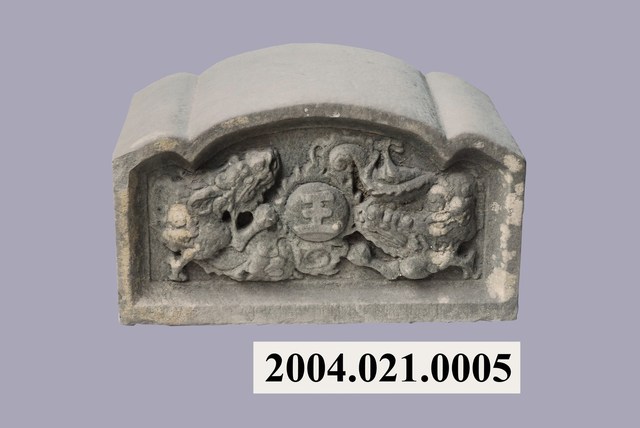 本件雙龍搶珠王氏石雕裝飾構件係以整塊石材一體成形雕刻,呈長42.4公分,寬27.6公分,高25.4公分長方體狀,頂面外觀作3道雲形圓弧轉折,僅正面雕刻,其餘立面皆呈素面。正面深鑿後作浮雕裝飾,其圖樣為雙龍搶珠樣式,左右兩側各有1龍伸爪奪珠,中央處雕刻火珠,火珠中帶有「王」字樣。本件石雕裝飾構件應為王姓民宅建築之裝飾物,其雕刻雙龍搶珠,多見廟宇屋頂,具有辟邪功能,同時由於龍具有呼風喚雨之能力,也具有避火的象徵意義。
