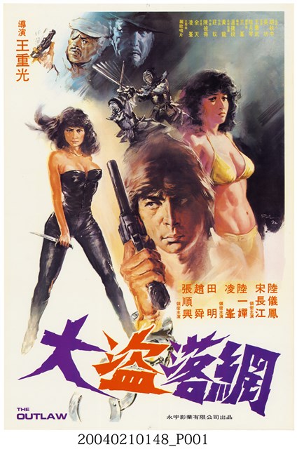 1.手繪電影海報大師陳子福之作,臺灣電影《大盜落網》上映時的中文彩色電影海報,直式印刷,海報上有陳子福簽名。畫面主要呈現男主角持槍的手腕銬著鬆脫的手銬,神情嚴肅的模樣,以及兩名女主角的造型:一身黑色緊身皮衣且手拿著短刀,擺出警戒的姿勢;穿著黃色三點式泳裝,一臉哀戚的模樣。2.本片是1982年由永宇影業公司出品,王重光執導,溫捷硯編劇,出品人胡執中、吳功,監製王華武、陰月琴,策劃王峯,美術指導黃龍,作詞莊奴,作曲陳彼得,主唱余天、淩峯,陸儀鳳、宋長江、陸一嬋、淩峯、田明、趙舜、張順興領銜主演的劇情片。
