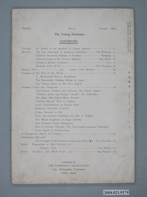 此為一紙質雜誌,此書為臺灣青年社於1962年10月25日出版的《臺灣青年》月刊第23號。 此件的出版者為「臺灣青年社」,「臺灣青年社」由東京大學講師王育德創立,並以日文發行《臺灣青年》雜誌宣揚臺獨理念。其後由於內部幹部認為只發行刊物並不足夠,因此於1963年組織化且改組為「臺灣青年會」,並在1965年5月日本臺獨的重要領袖廖文毅被迫從日本回到臺灣之後,於該年9月再改組為臺灣青年獨立聯盟,接續扛起日本臺獨勢力的大旗。改組後除發行刊物宣揚理念外,也曾在1966年美國國務卿出訪京都時,對美國支持中華民國政府的立場進行絕食抗議,但在1968年重要幹部柳文卿被遣返回臺的事件後,內部分裂且相關行動漸趨低調,最終使臺獨運動由日本轉至美國發展。臺灣青年獨立聯盟最終於1970年與臺獨聯盟合併,成為臺獨聯盟日本本部。(葉亭葶。2016。269) 在臺灣社會,關於「臺灣獨立」最早的具體事件為1947年發生的「815臺獨案」。在日本戰敗的背景下,一批臺灣仕紳與日本軍官共同研擬了「臺灣自治」方案,但遭總督安藤利吉反對,而後不了了之(陳儀深,2010。140-141)。二二八事件後,廖文毅、史明、王育德、黃昭堂等人在國外展開臺獨運動,並在多國建立臺獨組織。1960至1970年代,臺灣社會發生若干臺獨事件,其中彭明敏師生於1964年所發起的〈臺灣自救運動宣言〉最具代表性(陳儀深,2010。149-152)。解嚴前後,在蔡有全、許曹德、鄭南榕等人士的推動下,「臺獨」在臺灣社會逐漸受人接受。