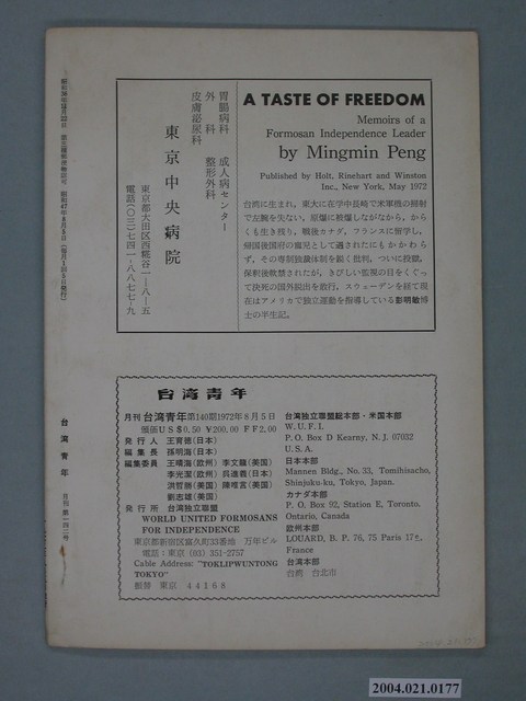此為一紙質雜誌,此書為臺灣獨立聯盟於1972年8月5日出版的《臺灣青年》月刊第142號。 此件的出版者為臺灣青年獨立聯盟,在1965年5月臺獨的重要領袖廖文毅被迫從日本回到臺灣之後,臺灣青年獨立聯盟於該年9月成立,接續扛起日本臺獨勢力的大旗。臺青聯前身為1960年創辦的「臺灣青年社」,由東京大學講師王育德創立,並以日文發行《臺灣青年》雜誌宣揚臺獨理念。其後由於內部幹部認為只發行刊物並不足夠,因此於1963年組織化且改組為「臺灣青年會」,後於1965年再改組成臺灣青年獨立聯盟。改組後除發行刊物宣揚理念外,也曾在1966年美國國務卿出訪京都時,對美國支持中華民國政府的立場進行絕食抗議,但在1968年重要幹部柳文卿被遣返回臺的事件後,內部分裂且相關行動漸趨低調,最終使臺獨運動由日本轉至美國發展。臺灣青年獨立聯盟最終於1970年與臺獨聯盟合併,成為臺獨聯盟日本本部。(葉亭葶。2016。269) 在臺灣社會,關於「臺灣獨立」最早的具體事件為1947年發生的「815臺獨案」。在日本戰敗的背景下,一批臺灣仕紳與日本軍官共同研擬了「臺灣自治」方案,但遭總督安藤利吉反對,而後不了了之(陳儀深,2010。140-141)。二二八事件後,廖文毅、史明、王育德、黃昭堂等人在國外展開臺獨運動,並在多國建立臺獨組織。1960至1970年代,臺灣社會發生若干臺獨事件,其中彭明敏師生於1964年所發起的〈臺灣自救運動宣言〉最具代表性(陳儀深,2010。149-152)。解嚴前後,在蔡有全、許曹德、鄭南榕等人士的推動下,「臺獨」在臺灣社會逐漸受人接受。