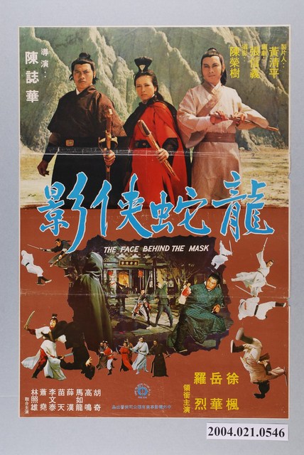 1.臺灣電影《龍蛇俠影》上映時的中文彩色海報,直式印刷。畫面主要呈現岳華、徐楓、羅烈三人手持劍,並肩站在一起、望向前方,背景為岩山的劇照,海報下半部為劍士與宅邸對抗多名黑衣人士的場景,以及角色打鬥的各種姿勢人像拼貼。搭配「THE FACE BEHIND THE MASK」等文案字樣。海報有二折折痕,右下側折痕處有破損。 2.本片是1977年由中外電影事業有限公司出品,陳誌華執導,張信義編劇,岳華、徐楓、羅烈主演的劇情片。