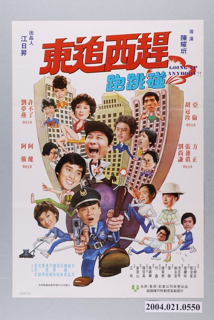 1.臺灣電影《東追西趕跑跳碰》上映時的中文彩色海報,直式印刷。畫面主要呈現三棟大廈前有一顆巨大的圓形炸彈,炸彈上頭站著服務員打扮的許不了,他大笑著舉著托盤上擺手弄姿的劉夢燕,炸彈旁圍繞著一群人,有微笑、跳躍走路的譚詠麟;推著打蠟清潔機的張盈真;身穿警察制服,一手拿警棍、一手拿槍的方正,另有三名角色拉著水管滅火,及安插在大廈裡,所有角色皆以卡通人身配上真人頭像,製造出趣味的意象。搭配「GOING UP ANYBODY?!」、「超級爆炸性動感喜劇鉅片」等文案字樣。海報有二折折痕。2.本片是1980年由永昇(香港)影業公司出品, 陳耀圻執導,戈筆編劇,譚詠麟(亞倫)、胡冠珍、許不了主演的喜劇片。