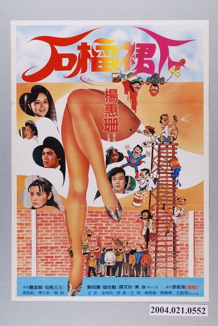1.臺灣電影《石榴裙下》上映時的中文彩色海報,直式印刷。畫面主要呈現一群漫畫小人們架高梯子,在牆上繪製白裙及裙下的一雙女子長腿,另有一群漫畫小人在底下抬頭探看裙底,白裙上有五個愛心框,並置入劇中角色的頭像。搭配「楊惠姍 領銜主演」等文案字樣。海報有二折折痕。2.本片是1982年由羅雲翰、司馬三三執導,小明編劇,楊惠姍、劉尚謙、寇世勳主演的劇情片。影片又名《石榴裙下只有我》,製作與發行公司不詳。