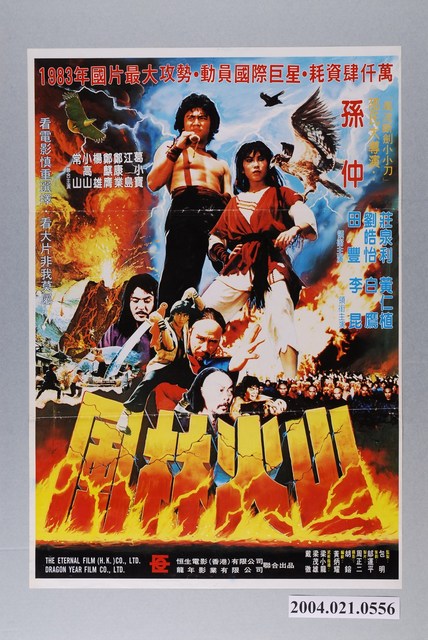 1.香港片《風林火山》上映時的中文彩色海報,直式印刷。畫面主要呈現莊泉利赤裸著上身的全身特寫,和劉皓怡雙手叉腰,肩上有隻老鷹的畫像,兩人後方背景為火山噴發、熔岩流竄、雷電交加, 和一群人聚集的場景與片名「風火山林」四字被火燃燒的模樣。搭配「1983年國片最大攻勢・動員國際巨星・耗資肆千萬」、「看電影慎重選擇・看大片非我莫屬」、「風流斷劍小小刀 邵氏大導演 孫仲」等文案字樣。海報有二折折痕。2.《風林火山》(香港:虎鷹;A Fist Full of Talons)是1983年香港功夫動作的電影,由恆生電影(香港)有限公司、龍年影業有限公司出品,恆生電影(香港)有限公司 (香港)發行,孫仲執導,黃炳耀編劇,莊泉利、黃仁植、 白鷹主演的劇情片。