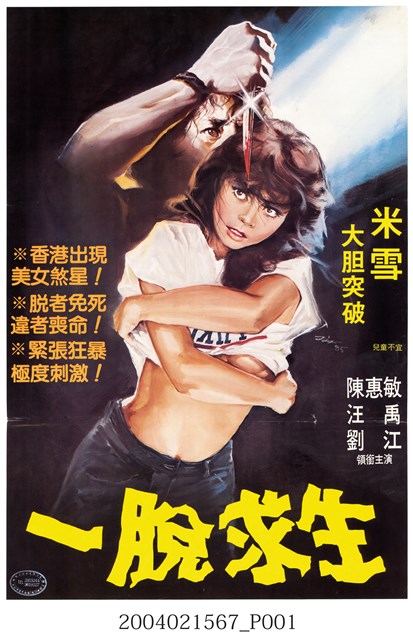 1.手繪海報大師陳子福之作,香港片《一脫求生》上映時的中文彩色海報,直式印刷。畫面主要呈現一名男子在黑暗中露出一隻手和半邊臉,手裡拿著一把沾血的短刀,眼睛呈現紅色地站在一名女子後方,女子雙手交叉拉住衣角,正將衣角往上拉露出小腹及些微胸部的畫像。搭配「米雪 大胆突破」、「兒童不宜」、「※香港出現美女煞星!」、「※脫者免死 違者喪命!」等文案字樣。海報上有陳子福簽名。海報有二折折痕。2.《一脫求生》(Mad Killer)是1984年香港的犯罪驚悚電影,由香港新華影業公司出品,香港新華影業公司 (香港)發行,李榮章執導,李榮章、童路編劇,陳惠敏、江禹、米雪、劉江主演的劇情片。