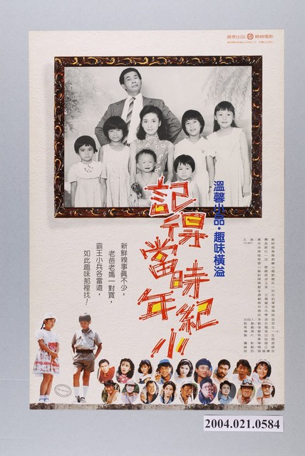 1.臺灣電影《記得當時年紀小》上映時的中文彩色海報,直式印刷。畫面主要呈現澎恰恰、林美照與五名女孩、一名男孩的全家福黑白照片,下方有18名角色頭像橫式拼貼。搭配「溫馨小品・趣味橫溢」、「新鮮糗事真不少,老爸老媽一對寶,霸王小兵各當道,如此趣味哪裡找!」等文案字樣。2.本片是1988年由鴻泰電影事業股份有限公司出品,源生電影事業股份有限公司發行,鄭進一執導,傅政輝編劇,黃膺勳、林美照、 澎恰恰主演的劇情片。