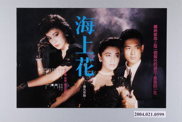 1.香港與臺灣合製片《海上花》上映時的中文彩色海報,橫式印刷。畫面主要呈現身穿黑色西裝的鶴見辰吾與穿著黑色禮服的張艾嘉頭靠在一起,一旁坐著也同樣身穿黑色禮服的姚煒,單手扶著頭的模樣,背景為一片黑幕裏冒出白煙。搭配「纏綿像海上每一個無名的浪花,是我的醫生」、「楊凡作品」、「海上花主題曲 羅大佑曲詞 郭小霖音樂 甄妮主唱」等文案字樣。海報左邊有皺摺。2.《海上花》(Immortal Story)是1986年香港與臺灣合製的愛情同性電影,由嘉禾影業機構、中央電影公司出品,楊凡編導,張艾嘉、姚煒、鶴見辰吾主演的劇情片。