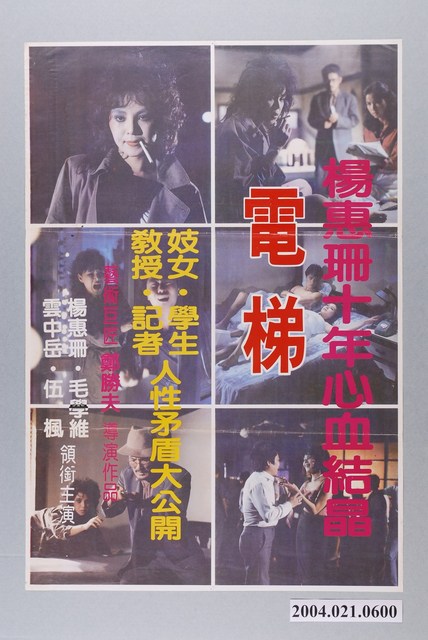 1.臺灣電影《電梯》上映時的中文彩色海報,直式印刷。畫面主要呈現六張劇照平均分割海報畫面,有畫著大濃妝、叼著菸的楊惠姍;在舞廳拉著男子領帶跳舞的楊惠姍等,片名及文案字樣以大字體壓在劇照上。搭配「楊惠珊十年心血結晶」、「妓女・學生・教授・記者 人性矛盾大公開」、「藝術巨匠 鄭勝夫 導演作品」等文案字樣。2.本片是1983年由太子電影出品,卓懋有限公司發行,鄭勝夫編導,楊惠珊、毛學維、雲中岳、伍楓主演的劇情片。