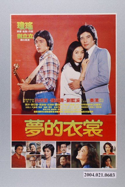 1.臺灣電影《夢的衣裳》上映時的中文彩色海報,直式印刷。畫面主要呈現呂琇菱與秦漢依偎抱在一起,鍾鎮濤背著吉他、一臉愁容站在一旁的模樣,片名下方為劇中角色的頭像拼貼。搭配「瓊瑤 原著・監製・作詞」、「劉立立精心導演」、「皇冠雜誌社贊助攝製並鄭重推薦」等文案字樣。2.本片是1981年由巨星(香港)影業公司出品,劉立立執導,喬野編劇,呂琇菱、鍾鎮濤、劉藍溪、秦漢主演的愛情文藝片。