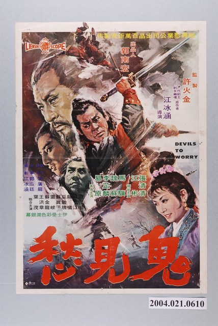 1.手繪海報大師陳子福之作,臺灣電影《鬼見愁》上映時的中文彩色海報,直式印刷。畫面主要呈現一名男子反手持劍揮舞,和張清清微笑的半身像,以及三名角色的頭像,海報上處繪有男子持劍騰飛的縮小人像,下處有兩名劍士對峙的縮小人像。搭配「監製 許火金」、「『一代劍王』『劍女幽魂』原作者 汪水涵 導演」、「英文片名:DEVILS TO WORRY」、「出品人:郭南宏」、「伊士曼彩色闊銀幕」等文案字樣。海報有六折折痕;左邊有破損;左上角有釘痕。2.本片是1970年由宏華國際影片(香港)有限公司出品,臺灣上映時以聯興影業公司名義出品,康業發行,江冰涵(郭南宏筆名)執導,楊通、江冰涵編劇,張清清、江彬、馬驥主演的古裝武俠劇情片。