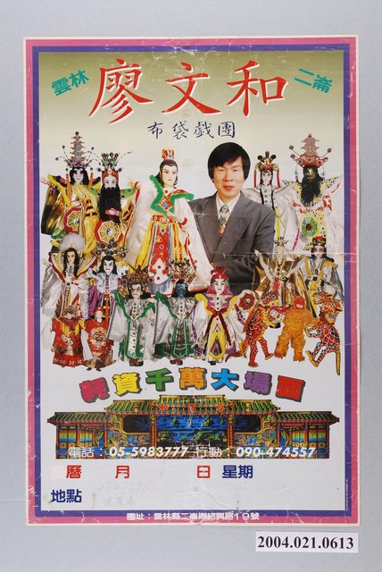 本件保存狀態良好,為雲林廖文和二崙布袋戲團演出海報,直幅彩色印刷。有廖文和與17尊布袋戲偶的合照,包括傳統尪某對、大型金光戲偶等,以及三個表演區的大型舞臺。印有電話:05-5983777,行動電話:090-474557,團址:雲林縣二崙鄉紹興路19號。演出日期與地點皆留空白可填寫。左下方有藍色原子筆手寫「2827296陳基春」字樣。