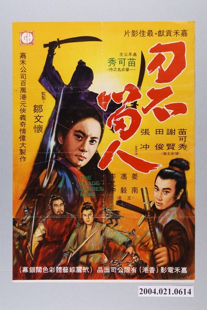 1.香港片《刀不留人》上映時的中文彩色海報,直式印刷。畫面主要呈現神情嚴肅的苗可秀持刀劈向前,身後有雙手持刀的人像剪影,和謝賢雙手各持劍、棍擺出警戒姿勢的畫像。搭配「嘉禾公司百萬港元狹義奇情偉大製作」、「嘉禾公主 苗可秀・一舉成名之作」、「監製:鄒文懷」、「(玳麗綜藝體彩色闊銀幕)」等文案字樣。海報有四折折痕。2.《刀不留人》(The Blade Spares None)是1971年香港的動作電影,由嘉禾電影(香港)有限公司出品,樂貿影視發行公司發行,葉榮祖執導,羅大維編劇,苗可秀、謝賢、田俊主演的劇情片。