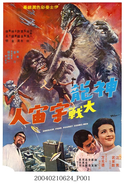 1.手繪海報大師陳子福之作,臺灣電影《神龍大戰宇宙人》上映時的中文彩色海報,直式印刷。畫面主要呈現金剛猩猩大戰恐龍,天空有飛機戰艦發射子彈攻擊恐龍,以及人型的怪物開槍射擊恐龍,海報下方為兩架飛碟圍繞著城市的一座高樓大廈,以及江青和武家麒的半身人像。搭配「伊士曼彩色闊銀幕」、「英文片名:DINOSAUR FIGHS AGAINST COSMIC-MEN」(海報英文少了T)、「新佳興企業公司出品國語影壇第一部激烈動作怪獸特技巨片」等文案字樣。海報有四折折痕;左下角、右下角有破損。2.本片是1969年由新佳興企業公司出品,李川編導,江青、武家麒、方光德主演的科幻特攝片。