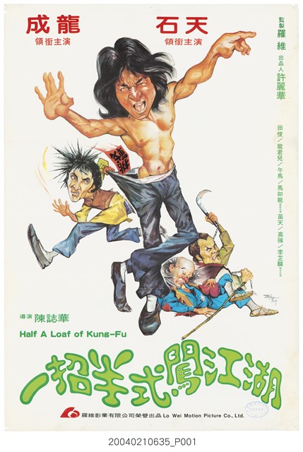 1.手繪海報大師陳子福之作,香港與臺灣合製片《一招半式闖江湖》上映時的中文彩色海報,直式印刷。畫面主要呈現赤裸著上身的成龍,被一名男子拉住褲頭,丟進一張印有「挑戰」二字的紅紙,成龍臉皺在一起、張大嘴的全身畫像,他的腳邊還躺著一名鼻子紅通通的白髮老人和拿著鐮刀的青臉男。海報有二折折痕;片名處蓋有藍色橢圓章。2.《一招半式闖江湖》(Half a Loaf of Kung Fu)是1978年香港與臺灣合製的功夫動作電影,由羅維影業有限公司出品,羅維影業有限公司發行,陳誌華執導,編劇成龍,成龍、石天、龍君兒主演的動作片。