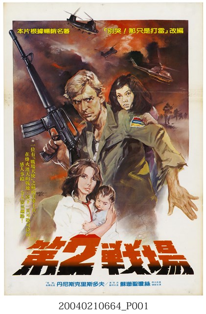 1.手繪海報大師陳子福設計,美國與日本合製片《第2戰場》上映時的中文彩色海報,直式印刷。畫面主要呈現丹尼斯可里斯多夫飾演一名在越南南部服役的美國陸軍士兵,手拿著步槍,背上背著一名女子的畫像,前景為蘇珊聖瓊斯飾演的女醫生,抱著一名嬰兒的畫像,背景為直升機軍機盤旋,士兵奔跑,天空一片紅黑色的戰爭場景。搭配「本片根據暢銷名著『別哭!那只是打雷』改編」、「『突破」金獎巨星 丹尼斯克里斯多夫 / 演技派藝術紅星 蘇珊聖瓊斯 兩大巨星 領銜主演」、「一位有『戰爭天使』之稱美軍士兵,在烽火連天的戰地,寫下一頁可歌可泣的感人事蹟…令人盪氣迴腸!」 等文案字樣。海報有二折折痕。2.《第2戰場》(Don't Cry, It's Only Thunder)是1982年美國與日本合製戰爭電影,由Sanrio Communications出品,Sanrio Communications、The Samuel Goldwyn Company發行,Peter Werner執導,Paul G. Hensler編劇, 丹尼斯可里斯多夫(Dennis Christopher)、蘇珊聖瓊斯(Susan Saint James)、Roger Aaron Brown主演的劇情片。
