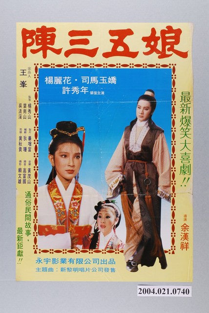 1.臺灣電影《陳三五娘》上映時的中文彩色海報,直式印刷。畫面主要呈現楊麗花飾演的陳三向前走的劇照人像,以及司馬玉嬌和許秀年的半身人像。搭配「通俗民間故事,最新鉅獻」、「最新爆笑大喜劇」、「主題曲:新黎明唱片公司發售」等文案字樣。海報有六折折痕;左上角有變形。2.本片是1981年由永宇影業有限公司出品,永宇影業有限公司發行,余漢祥執導,狄珊編劇,司馬玉嬌、楊麗花、許秀年主演的臺語戲曲片。
