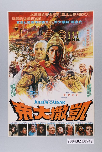 1.英國片《凱撒大帝》上映時的中文彩色海報,橫式印刷。畫面主要呈現頭戴卻爾登希斯頓飾演Mark Antony和白髮的約翰吉爾加德爵士飾演凱薩大帝,倆人的半身畫像,及一隻石獅子從口中噴發火焰,和凱薩大帝遭多人刺死的場景,背景為兵馬竄動,一片火海的場景,片名下面置有九張角色頭像劇照,配有中文譯名,而海報英文片名上方繪有70mm圖案。搭配「大文豪『莎士比亞』不朽名著在銀幕首次最成功的演出」、「『十誡』『賓漢』天王影帝 卻爾登希斯頓 等數十國際巨星聯合演出」、「莎劇權威『王子復仇記』大導演 司徒勃奇 最精心傑作」、「70 mm特藝彩色」等文案字樣。海報有四折折痕;四角、左右邊中間處有黏膠帶。2.《凱撒大帝》(Julius Caesar)是1970年英國的歷史戰爭電影,由Commonwealth United Entertainment出品,Commonwealth United Entertainment發行, 司徒勃奇(Stuart Burge)執導,Robert Furnival編劇,卻爾登希斯頓(Charlton Heston)、傑遜勞勃斯(Jason Robards、約翰吉爾加德爵士(John Gielgud)主演的劇情片。