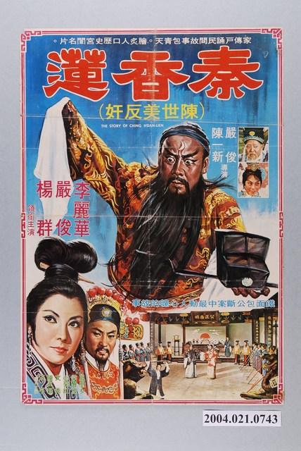 1.香港片《秦香蓮》上映時的中文彩色海報,直式印刷。畫面主要呈現嚴俊飾演的黑面包公摘帽、舞袖,怒視前方的半身畫像,和李麗華(飾演秦香蓮)、楊群(飾演陳世美)的頭部畫像,以及包公在衙門審訊陳世美案的劇照。搭配「(陳世美反奸)」、「家傳戶誦民間故事包青天。膾炙人口歷史宮闈名片。」、「鐵面包公斷案最動人心魄的故事」等文案字樣。海報有七折折痕。