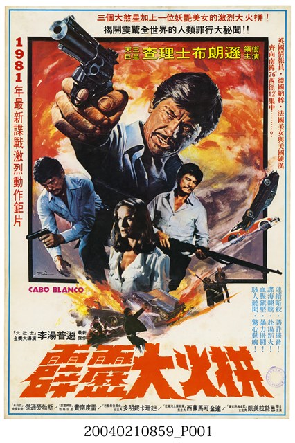 1.手繪海報大師陳子福之作,墨西哥與美國合製片《霹靂大火拼》上映時的中文彩色海報,直式印刷。畫面主要呈現 查理士布朗遜持槍指向前的半身特寫畫像,以及查理士布朗遜分別持長、短槍,與多明妮卡珊妲的劇照半身人像,融合車子互撞、槍戰等陷入火海的場景。搭配「三個大煞星加上一位妖艷美女的激烈大火拚!揭開震驚全世界的人類罪行大秘聞!!」、「天王巨星 查理士布朗孫 領銜主演」、「1981年最新諜戰激烈動作鉅片」、「『六壯士』金獎大導演 李湯普遜 最新傑作」、「『茱莉亞』金獎影帝 傑遜勞勃斯 / 『霹靂神探』性格巨星 費南度雷 / 『巴黎最後探戈』女主角 多明妮卡珊妲 / 『尼羅河上謀殺案』男主角 西蒙馬可今達 / 『麥坎納淘金記』女主角 凱美拉絲芭 聯合主演」等文案字樣。海報有二折折痕;右下處有蓋圓形章。2.《霹靂大火拼》(Caboblanco)是1980年墨西哥與美國合製的犯罪動作電影,由Arco Films、Cabo Blanco Production Inc.、MVS Televisión出品,Embassy Pictures(美國)發行,李湯普遜(J. Lee Thompson)執導,Morton S. Fine、Milton S. Gelman、James Granby Hunter編劇, 查理士布朗遜(Charles Bronson)、傑遜勞勃斯(Jason Robards)、多明妮卡珊妲(Dominique Sanda)主演的劇情片。