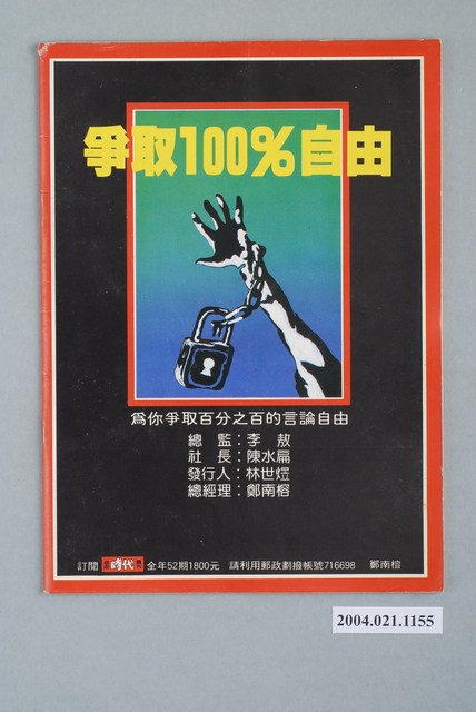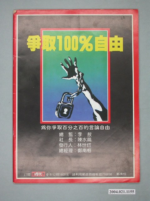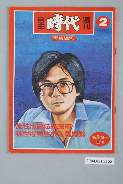 此為一紙質雜誌,此物件以肖像畫為封面,並以白色字體標示物件之名稱,本物件為1984年3月發行之《自由時代》週刊第二期,封面內容計有〈施性忠闘法省政府〉、〈林世煜與生根人馬總辭〉等。目錄計有(一)封面專題之一――林世煜與生根總辭、(1)進步˙深耕˙生根˙停擺!(弄臣)、(2)生根下馬的故事(宗志)、(3)剪斷臍帶,黨工開步走(曾心儀)、(4)林世煜剪影(王良騏)、(二)封面專題之二――施性忠鬪法省政府(陳敏)、(1)施性忠――永不停止戰鬪的民主先鋒、(2)施性忠的履歷表、(3)施性忠的「內閣」、(4)新竹市民要求撤換張賢東、(5)新竹市的「不市長」――張賢東、(三)地方報導、(1)北市議會風波多(明山)、(2)蘇南成的髒亂秀(愚公)、(3)看誰暴動我就開槍(陳南嘉)、(四)公共政策、(1)有八萬大軍沒有農業部(趙次民)、(2)李登輝請留步(陳東天)、(3)沙人悲歌(王健峯)、(五)國民黨洋相集、(1)李登輝斜吹邪風(孟絕子)、(六)黨外動態、(1)國防部不准黃華奔母喪∕吳祥輝因票據罰入獄、(2)前進被控誹謗即將開庭(七)國際掃描(魏明)、(1)葡萄牙醞釀限制新聞自由∕法國左派城鎮右派勝選(2)華勒沙要求波共妥協∕辛巴布威反對黨領袖抗議政府暴行(八)人權詩頁:星星(施善繼)、(九)黨外立委總質詢、(1)特赦˙黨禁˙司法獨立-黨外立委聯合質詢政院、(2)尊重在野制衡力量(鄭余鎮)、(3)消除省籍觀念˙打破政治不平等共同來促進進步安定與和諧的社會(許榮淑)、(十)鄧維楨政治問答(本刊策劃)、(十一)編輯室報告 等。 此物件為《自由時代》系列雜誌之一,《自由時代》是黨外政論雜誌之一,於1984年3月12日由鄭南榕所創辦,並且標榜「爭取百分之百的言論自由」,雜誌內容致力於追蹤黨國內幕、打破禁忌話題、評議時政,同時也籌劃街頭社會運動,如:「五一九綠色行動」,其中鄭南榕為保護幫《自由時代》雜誌撰寫文章的作者,於是在目錄標示鄭南榕承擔一切文章的責任,且不在雜誌目錄頁寫上作者姓名。最終在1989年11月11日,鄭南榕自焚身亡7個月後,《自由時代》停刊。所謂「黨外」為中國國民黨之外的政治勢力,「黨外」在國民黨政府的治下運用創辦雜誌的方式表達立場、對抗國民黨政府,這些雜誌、出版品被稱為「黨外雜誌」,《自由時代》亦是其中之一。
