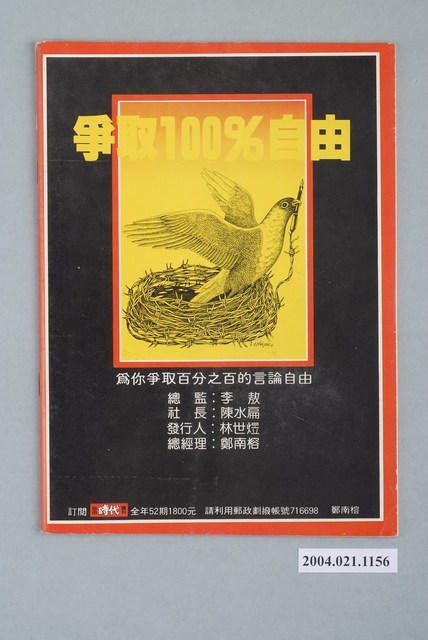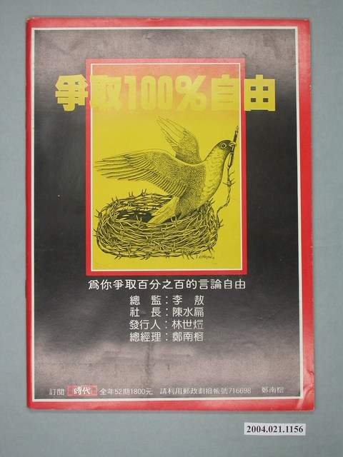 此為一紙質雜誌,此物件以肖像畫為封面,並以白色字體標示物件之名稱,本物件為1984年3月發行之《自由時代》週刊第三期,封面內容計有〈蔡家兄弟搶銀行〉等。目錄計有(一)封面專題-國泰蔡家兄弟搶銀行、(1)李師科該死˙蔡辰男爽死(鄭史公)、(2)國泰集團的銀行夢(陳天霸)、(3)蔡辰洋搶灘臺南企銀(瀟湘)、(4)臺南中小企銀的「封建」祖譜、(二)熱門新聞、(1)中正機場的劫機之謎(陳敏)、(三)地方報導、(1)八仙過海直搗毛連塭(牧野)、(2)高縣派系介入垃圾戰爭(柯百廣)、(3)劉裕猷又穿梆(陳敏)、(4)戰鼓頻催話風城(仲鳴)、(5)張賢東撒嬌省政府(陳敏)、(四)公共政策、(1)尖端科技大竊案(弄臣)、(2)臺大代聯會支持學生申訴制度(曾心儀)、(3)人情大包袱(黃小璜)、(4)金鐘獎肥了電視瘦了廣播(方外)、(5)華航開闢環球航線(余爭)、(五)黨外動態、(六)生根總辭餘音繞樑(本社)、(七)獨裁者列傳-墨索里尼(小民)、(八)國民黨洋相集――孟絕子日記、(九)臺灣政治人物追踪――王玉雲能東山再起嗎?(魏森)、(十)國會報導、(1)總統選舉妙事多選(陳世凡)、(十一)黨外副刊、(1)一帖冰冷的清涼劑(陳錫福)、(2)「大冤獄」控訴大冤獄(電影介紹)(黃心義)、(十二)鄧維楨政治問答、(十三)編輯室報告 等。 此物件為《自由時代》系列雜誌之一,《自由時代》是黨外政論雜誌之一,於1984年3月12日由鄭南榕所創辦,並且標榜「爭取百分之百的言論自由」,雜誌內容致力於追蹤黨國內幕、打破禁忌話題、評議時政,同時也籌劃街頭社會運動,如:「五一九綠色行動」,其中鄭南榕為保護幫《自由時代》雜誌撰寫文章的作者,於是在目錄標示鄭南榕承擔一切文章的責任,且不在雜誌目錄頁寫上作者姓名。最終在1989年11月11日,鄭南榕自焚身亡7個月後,《自由時代》停刊。所謂「黨外」為中國國民黨之外的政治勢力,「黨外」在國民黨政府的治下運用創辦雜誌的方式表達立場、對抗國民黨政府,這些雜誌、出版品被稱為「黨外雜誌」,《自由時代》亦是其中之一。