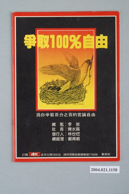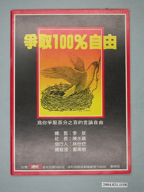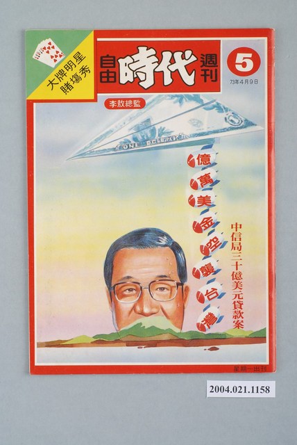 此為一紙質雜誌,此物件以插圖為封面,並以白色字體標示物件之名稱,本物件為1984年4月發行之《自由時代》週刊第五期,封面內容計有〈億萬美金空襲臺灣――中信局三十億美元貸款案〉、〈大牌明星賭場秀〉等。目錄計有(一)封面主題、(1)億萬美金空襲臺灣――中信局三十億美元貸款疑案(鄭可強)、(2)國民黨的最佳掌櫃-俞國華(管家豪)、(3)還給人民持有外匯的自由(余耀泉)、(4)中信局應該裁撤、(二)臺灣政治人物追踪、(1)「幕後國會議長」趙自齊(徐浩)、(三)封面專題、(1)大牌明星賭場秀(鄭排長)、(四)台北風聲、(1)蔣經國第二任期的施政方針∕蔡辰洲花錢買廣告、(2)國民黨為「模式」苦惱∕林洋港耍最後一次威風、(五)公共政策、(1)基本工資的「勞資」糾紛(宗祺)、(2)對「勞支會」的展望(曾心儀)、(六)財經短評、(1)駐外經濟商務人員大拜拜∕火車票價又將上漲、(2)兪國華「脫法」管制外匯∕臺電的三千萬元研究費、(七)地方報導、(1)金門人無「機」可乘(張無忌)、(2)超級違建落誰家?(牧野)、(3)遙遙無期的無頭「工」案――看榮工處˙中華工程公司如何胡來!(林慕恭)、(4)新竹市長補選戰雲密佈(竹風)、(5)灣裡戴奧辛的難題(瀟湘)、(6)國民中學內的性騷擾(聞則怒)、(八)黨外動態、(1)黨外成立「勞支會」∕「聯誼之夜」即將開鑼、(2)編聯會入會啟事∕李敖在「臺灣春秋」批判柏楊、(3)黨外立委協議每週聯合質詢、(4)楊青矗將赴臺南主持座談會、(5)北教會邀請方素敏等人訪美、(九)評黨外「敗不相救」的惡習(路不平)、(十)國民黨洋相集、(1)破壞選舉,原來就是它!(孟絕子)、(十一)南臺灣風雲、(1)臺灣時報的「性騷擾」∕王玉珍闘垮李昆明、(2)施淵源高市稱老大∕林武俊高調南縣、(3)周清玉競選臺南市長∕尤清與南市黨外聚會、(4)臺南市民抗議蘇南成(十二)大亨小傳、(1)跑路財神――劉成懿《出道篇》(陶朱太史)、(十三)人權新聞、(1)張銘傳繼續奮鬪(陳仁)、(十四)鄧維楨政治問答、(十五)編輯室報告 等。 此物件為《自由時代》系列雜誌之一,《自由時代》是黨外政論雜誌之一,於1984年3月12日由鄭南榕所創辦,並且標榜「爭取百分之百的言論自由」,雜誌內容致力於追蹤黨國內幕、打破禁忌話題、評議時政,同時也籌劃街頭社會運動,如:「五一九綠色行動」,其中鄭南榕為保護幫《自由時代》雜誌撰寫文章的作者,於是在目錄標示鄭南榕承擔一切文章的責任,且不在雜誌目錄頁寫上作者姓名。最終在1989年11月11日,鄭南榕自焚身亡7個月後,《自由時代》停刊。所謂「黨外」為中國國民黨之外的政治勢力,「黨外」在國民黨政府的治下運用創辦雜誌的方式表達立場、對抗國民黨政府,這些雜誌、出版品被稱為「黨外雜誌」,《自由時代》亦是其中之一。