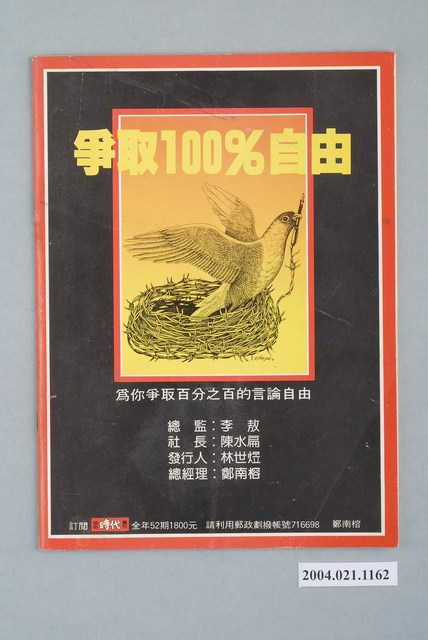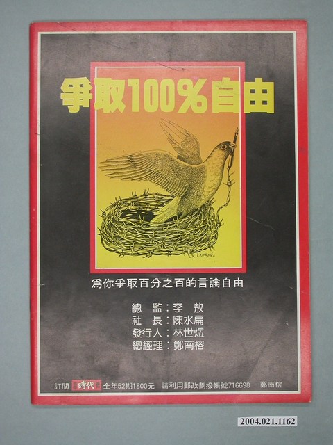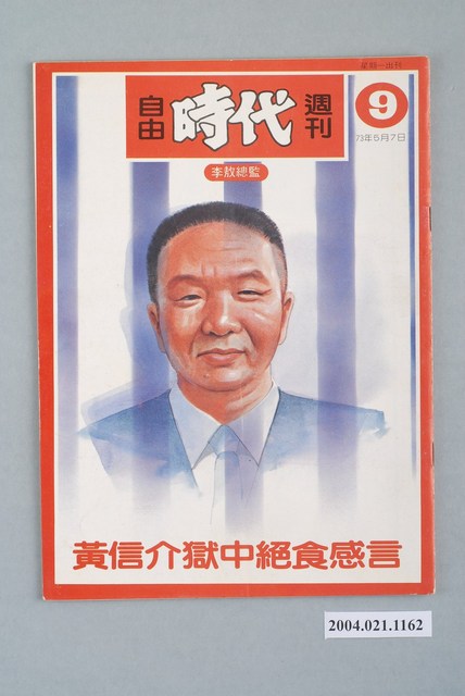 此為一紙質雜誌,此物件以肖像畫為封面,並以白色字體標示物件之名稱,本物件為1984年5月發行之《自由時代》週刊第九期,封面內容計有〈黃信介獄中絕食感言〉等。目錄計有(一)封面主題――聲援美麗島受刑人無限期絕食!、(1)追求民主˙分擔苦難――牆裡絕食牆外聲援全面展開(陳為銘)、(2)黃信介獄中絕食感言(本社)、(3)停止高壓解除戒嚴˙還政於民、(4)請大家關心美麗島政治犯絕食活動、(5)黃信介的歷史鏡頭、(6)絕食過程的生理狀態、(7)淺釋絕食、(二)時代新聞、(1)無法無天的判決――李敖對施性忠被判刑的感想(本社採訪)、(2)李焜泰˙釋開封(何尚)、(3)又是一張乖乖牌――臺大醫院院長到底能幹什麼?(王健峯)、(4)勞工問題(楊宗祺)、(5)對抗美商壟斷資訊市場,日本修改軟體著作權法(萬卜元)、(6)絕食˙幽默˙特赦――台北市黨外議員總質詢側記(陳錫福)、(三)都是臺大民族主義論戰惹的禍(一)(孫慶餘)、(四)張春男出獄(曾心儀)、(五)臺灣諺語新解(李阿輝)、(1)別人的子,死未了、(六)黨外立委聯合書面質詢(張俊雄等七人)、(1)運費非法漲價失信於民、(七)鄧維楨政治問答、(八)編輯室報告、(九)台北風聲、(十)南臺灣風雲、(十一)黨外動態、(十二)孟絕子專欄、(1)國策會議-獻給黨外絕食的勇士們 等。 此物件為《自由時代》系列雜誌之一,《自由時代》是黨外政論雜誌之一,於1984年3月12日由鄭南榕所創辦,並且標榜「爭取百分之百的言論自由」,雜誌內容致力於追蹤黨國內幕、打破禁忌話題、評議時政,同時也籌劃街頭社會運動,如:「五一九綠色行動」,其中鄭南榕為保護幫《自由時代》雜誌撰寫文章的作者,於是在目錄標示鄭南榕承擔一切文章的責任,且不在雜誌目錄頁寫上作者姓名。最終在1989年11月11日,鄭南榕自焚身亡7個月後,《自由時代》停刊。所謂「黨外」為中國國民黨之外的政治勢力,「黨外」在國民黨政府的治下運用創辦雜誌的方式表達立場、對抗國民黨政府,這些雜誌、出版品被稱為「黨外雜誌」,《自由時代》亦是其中之一。