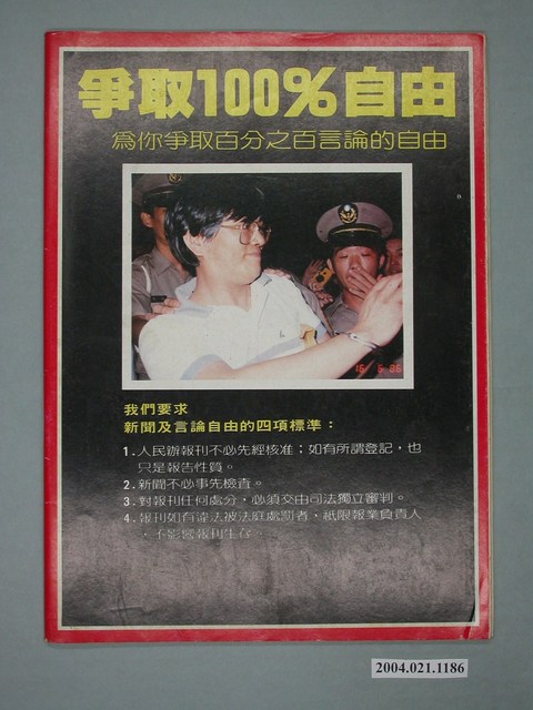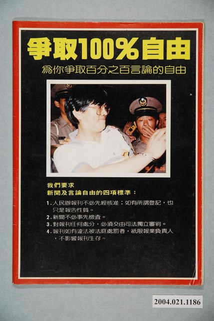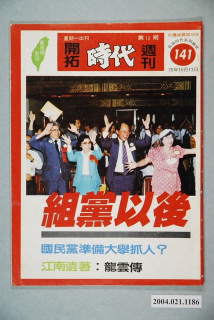 此為一紙質雜誌,此物件以照片為封面,並以白色字體標示物件之名稱,本物件為1986年10月發行之《開拓時代》週刊第13期(自由時代系列總號第141號),封面內容計有〈組黨以後〉、〈國民黨準備大舉抓人?〉、〈江南遺著:龍雲傳〉等。目錄計有(一)封面故事、(1)國民黨準備大舉抓人!?、(2)故國小組和固安4號演習――國民黨打算重施故技?、(3)這一次輪到臺灣人做拜拜!――記洛杉磯「民主進步黨」海外組織成立大會、(4)島內組黨,海外響應、(5)如何對待「海外組織」?、(6)我要陪許信良回臺灣!――謝聰敏訪問記、(7)一切,都為了組黨的卑微心願――記黨外立委總質詢、(8)全力封殺「新黨」候選人――國民黨鎮壓民主進步黨的第一波、(9)「民主進步黨」何時召開黨員大會為宜?、(10)新黨成立大家談、(11)加速完成建檔工作,請大家告訴大家、(12)「新黨的發展」座談會摘要、(二)時代觀點、(1)請趕快吧!、(三)焦點新聞、(1)藥罐堆中度國慶――蔣經國與蔣緯國的健康、(2)林正杰獄中聲明、(3)林正杰家屬的聲明、(3)第二屆民主實踐研究班即將舉辦、(四)專題報導、(1)魂兮歸來阿兵哥――「運兵船沈沒事件」追踪報導、(五)臺灣現象、(1)當面說解嚴,背後下辣手――國民黨草擬「國家安全法」、(2)蔣經國說:戒嚴就要解除了!、(3)「大家樂」難擋「黃金樂」登場、(六)長篇連載、(1)龍雲傳、(七)萬能記者阿吉仔、(1)民主進片救臺灣步、(2)國民黨官心酸酸 等。 此物件為《自由時代》系列雜誌之一,《自由時代》是黨外政論雜誌之一,於1984年3月12日由鄭南榕所創辦,並且標榜「爭取百分之百的言論自由」,雜誌內容致力於追蹤黨國內幕、打破禁忌話題、評議時政,同時也籌劃街頭社會運動,如:「五一九綠色行動」,其中鄭南榕為保護幫《自由時代》雜誌撰寫文章的作者,於是在目錄標示鄭南榕承擔一切文章的責任,且不在雜誌目錄頁寫上作者姓名。最終在1989年11月11日,鄭南榕自焚身亡7個月後,《自由時代》停刊。所謂「黨外」為中國國民黨之外的政治勢力,「黨外」在國民黨政府的治下運用創辦雜誌的方式表達立場、對抗國民黨政府,這些雜誌、出版品被稱為「黨外雜誌」,《自由時代》亦是其中之一。