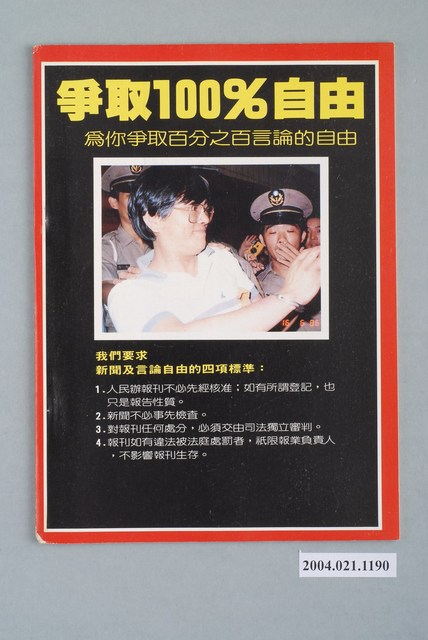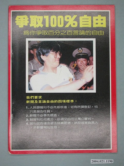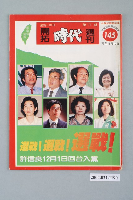 此為一紙質雜誌,此物件以照片為封面,並以白色字體標示物件之名稱,本物件為1986年11月發行之《開拓時代》週刊第17期(自由時代系列總號第145號),封面內容計有〈選戰!選戰!選戰!〉、〈許信良12月1日回台入黨〉等。目錄計有(一)封面故事、(1)台北市――兩黨大對決、(2)第一選區――北臺灣風雲緊急、(3)第二選區――在許信良的影子下、(4)第三選區――八方風雨會中州、(5)第四選區――緊張有餘,精彩不足、(6)第五選區――仍是舊人天下、(7)高雄市――變生肘腋、大勢底定、(二)自由觀點、(1)停止制訂「國家安全法」、(三)專題報導、(1)民主進步黨黨綱(草案)、(2)民主進步黨黨草(草案)、(四)焦點新聞、(1)海外同鄉的返鄉聖戰――「百人代表團」擬十一月十三日返臺、(五)臺灣現象、(1)宋美齡漫長的十分鐘――蔣介石百年冥誕紀念會現場報導、(2)宋美齡如何再起?、(3)惡法快要出籠了!――國民黨的「解嚴文字遊戲」、(4)中美貿易談判,豈可棄帥保卒――評美國三○一法案的前因後果、(5)既不延,也不緩――中央社堅持錯誤報導、(6)選前清場,教徒上山――「綠野專案小組」奉命擺平新約教徒、(7)揭開假釋的真面具――國民黨釋放十三名政治犯的背後、(8)十月政治怪譚、(六)天下傳真、(1)國民黨的靠山倒了?――美國期中選舉對國民黨的影響、(2)南韓政治衝突節節高、(七)萬能記者阿吉仔、(1)許信良回臺灣,要過三關、(2)國民黨不要臉,說翻就翻 等。 此物件為《自由時代》系列雜誌之一,《自由時代》是黨外政論雜誌之一,於1984年3月12日由鄭南榕所創辦,並且標榜「爭取百分之百的言論自由」,雜誌內容致力於追蹤黨國內幕、打破禁忌話題、評議時政,同時也籌劃街頭社會運動,如:「五一九綠色行動」,其中鄭南榕為保護幫《自由時代》雜誌撰寫文章的作者,於是在目錄標示鄭南榕承擔一切文章的責任,且不在雜誌目錄頁寫上作者姓名。最終在1989年11月11日,鄭南榕自焚身亡7個月後,《自由時代》停刊。所謂「黨外」為中國國民黨之外的政治勢力,「黨外」在國民黨政府的治下運用創辦雜誌的方式表達立場、對抗國民黨政府,這些雜誌、出版品被稱為「黨外雜誌」,《自由時代》亦是其中之一。